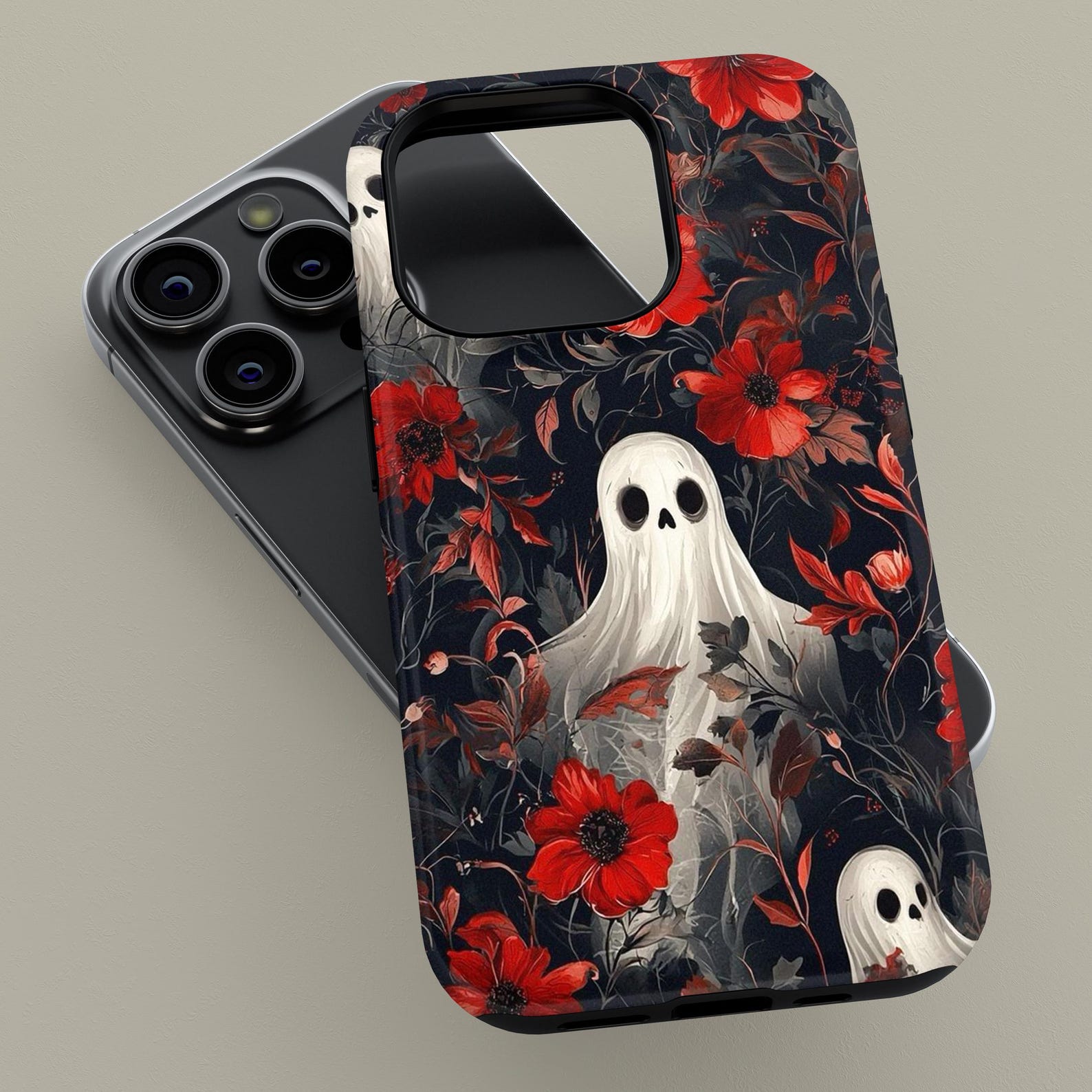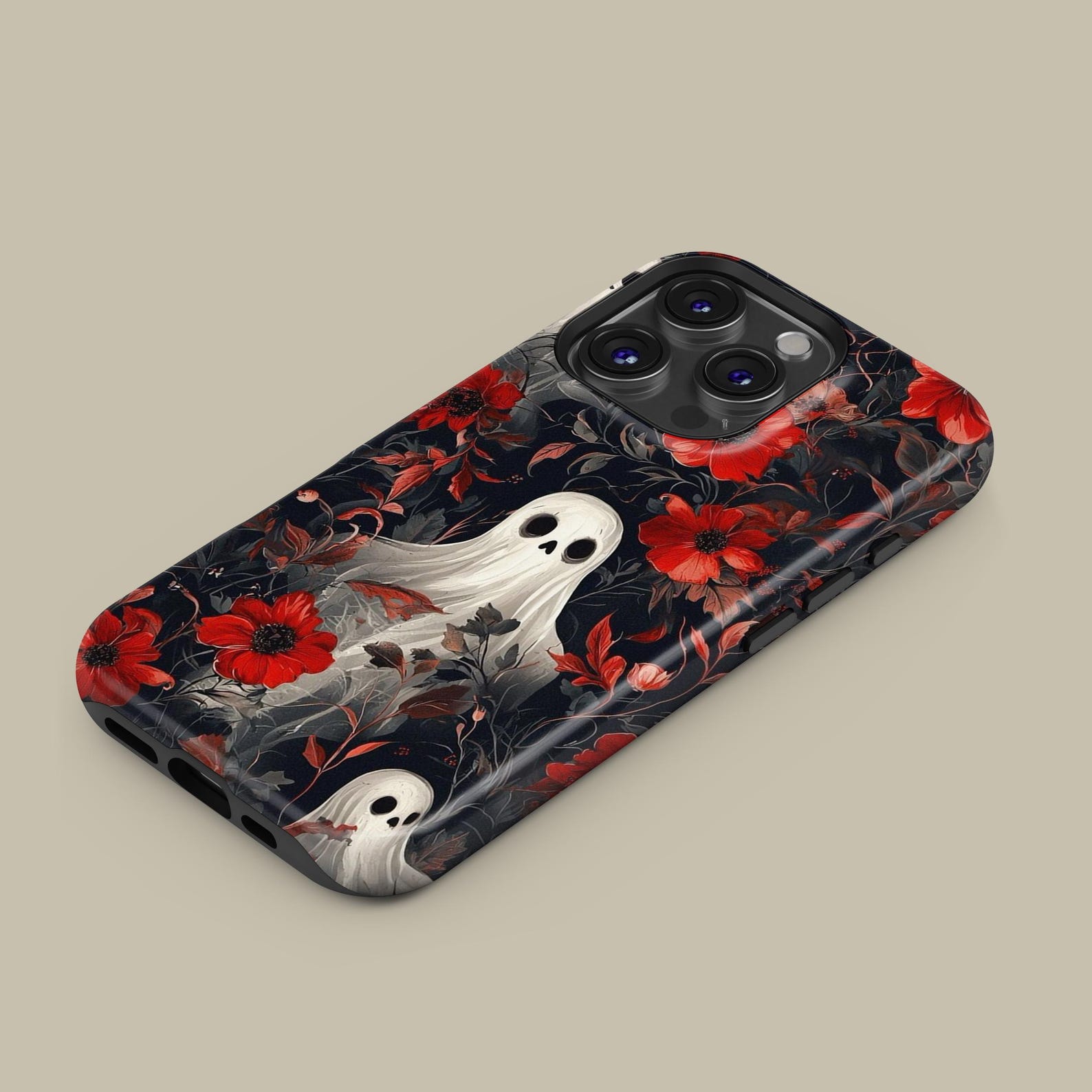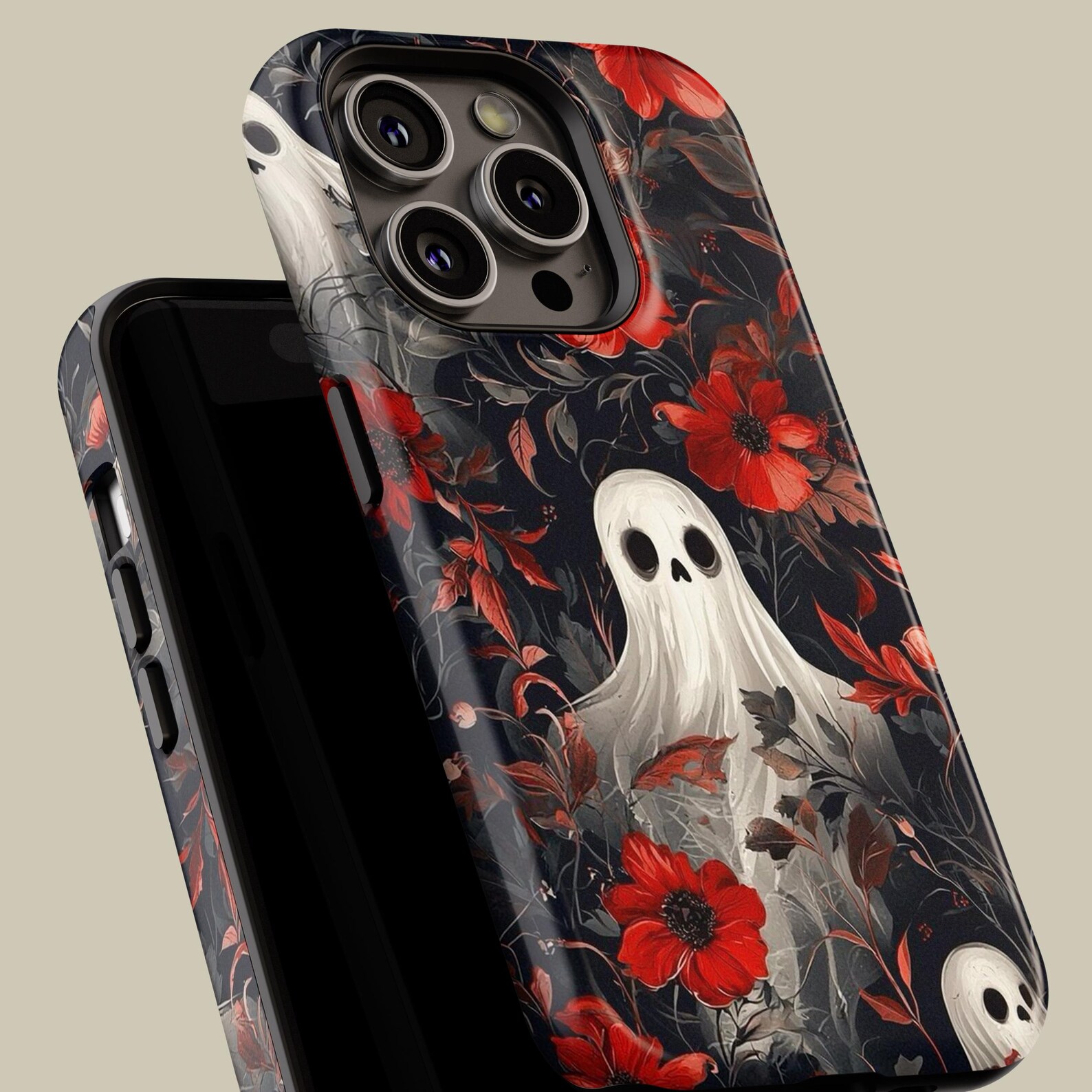 This enchanting phone case features a playful design with whimsical ghost motifs intertwined with vibrant red flowers. The deep navy background enhances the bold colors, creating a striking contrast that is both spooky and stylish. Crafted from durable materials, this tough case provides excellent protection while maintaining a lightweight feel. Its unique artistic style brings a fun, modern vibe, perfect for those who appreciate a touch of the eerie in their accessories.
