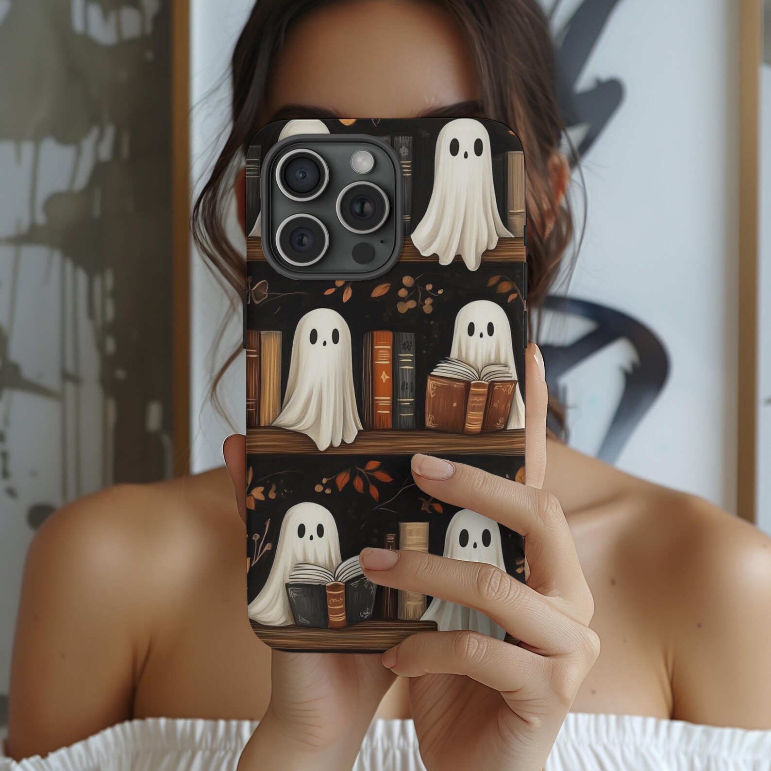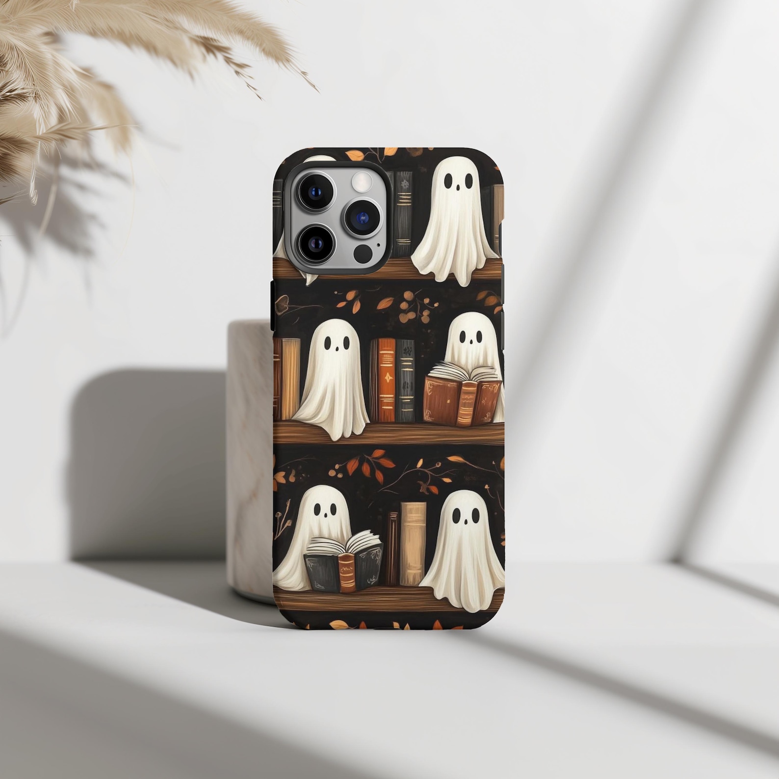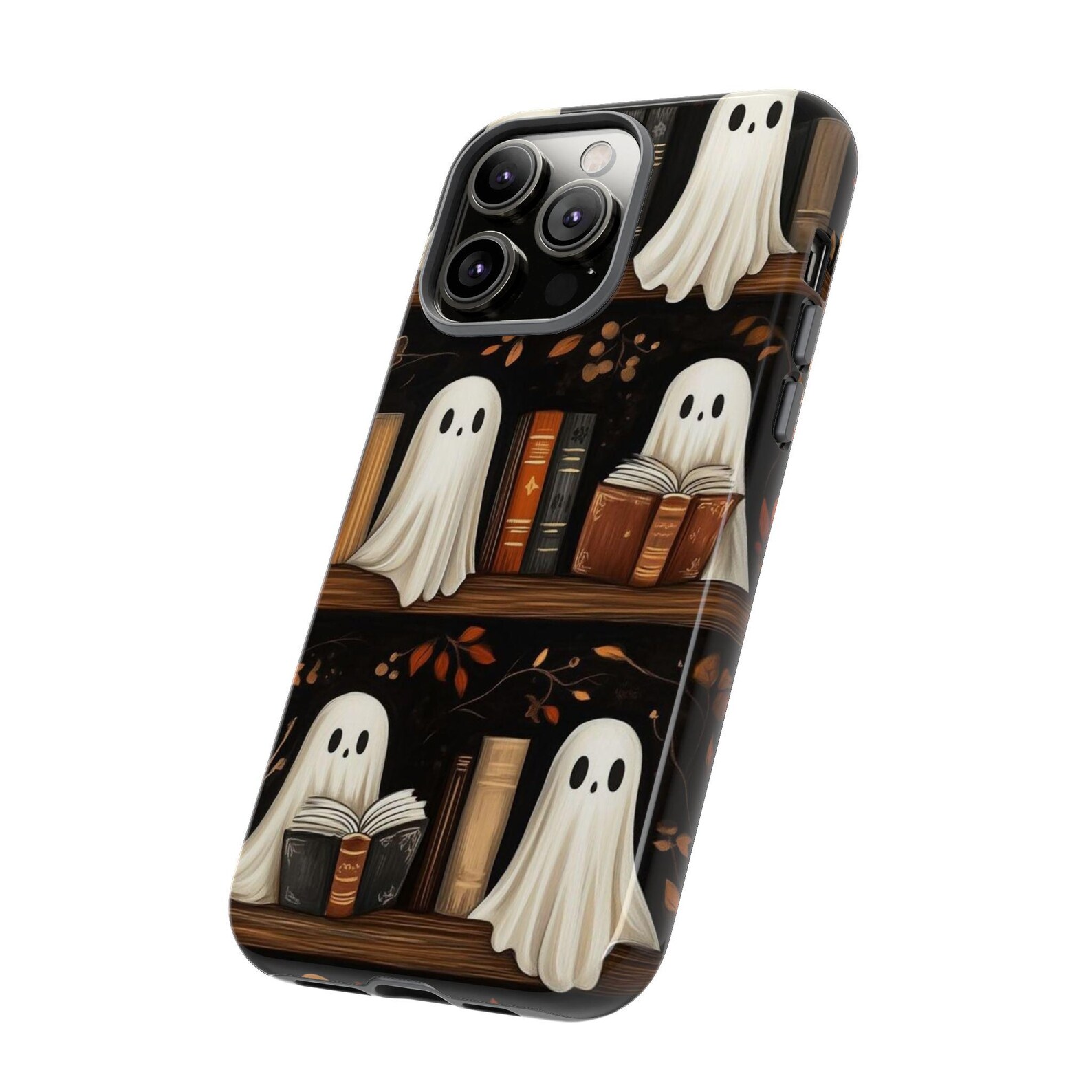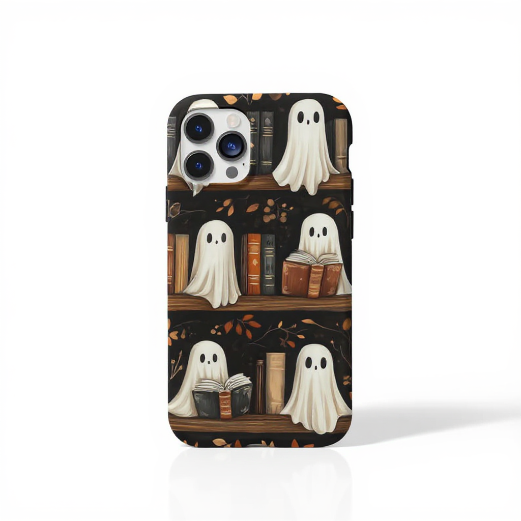 Embrace a playful aesthetic with this charming phone case featuring cute ghost designs nestled among books. The earthy tones of browns and greens create a cozy, autumnal vibe, perfect for book lovers and those who enjoy a hint of whimsy. Made from durable materials, this case provides excellent protection while showcasing a glossy finish that highlights the vibrant artwork. Ideal for adding a touch of unique character to your essentials.