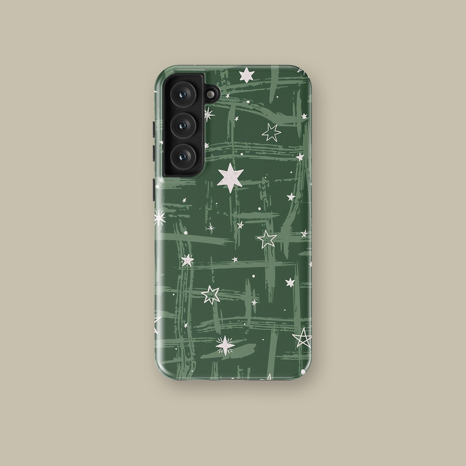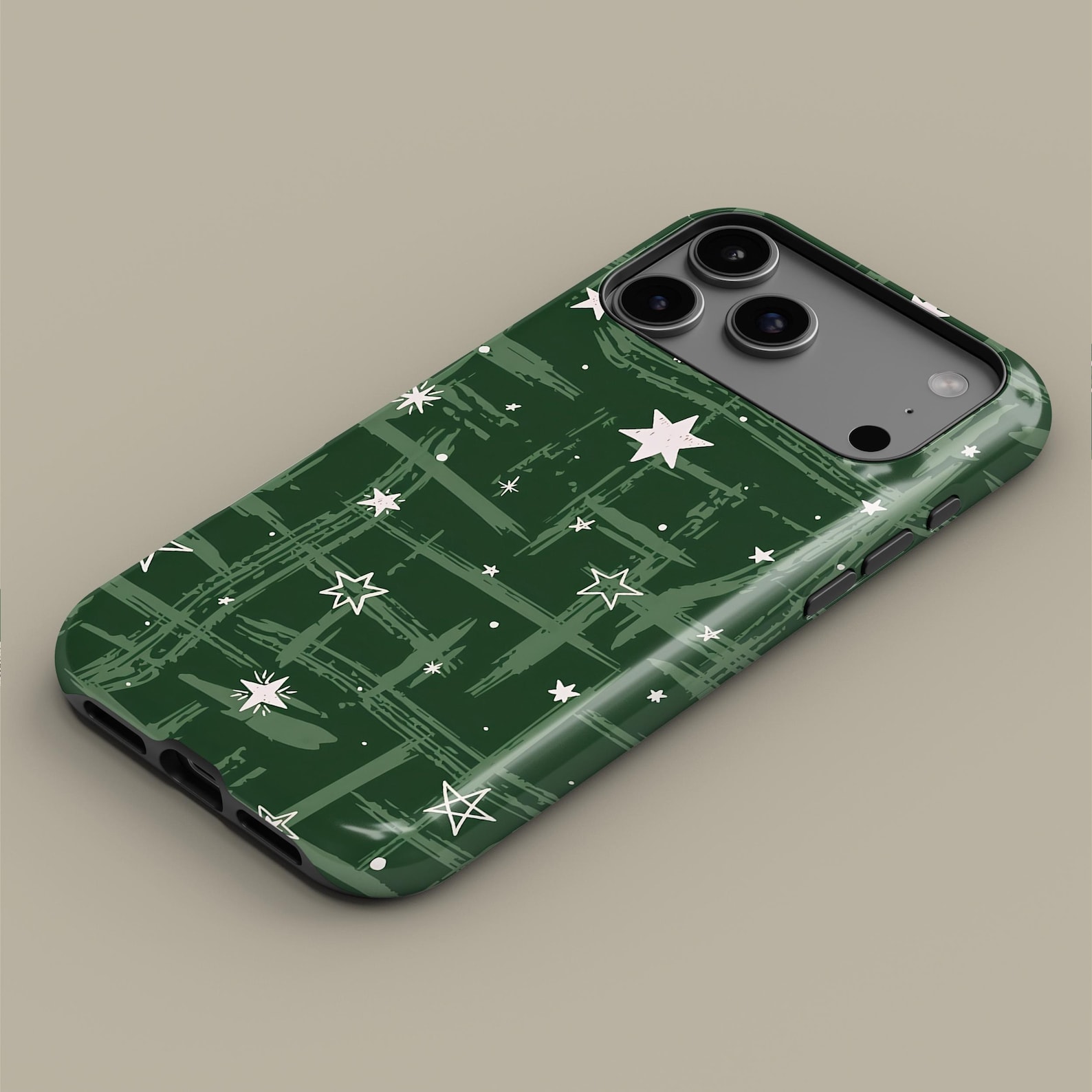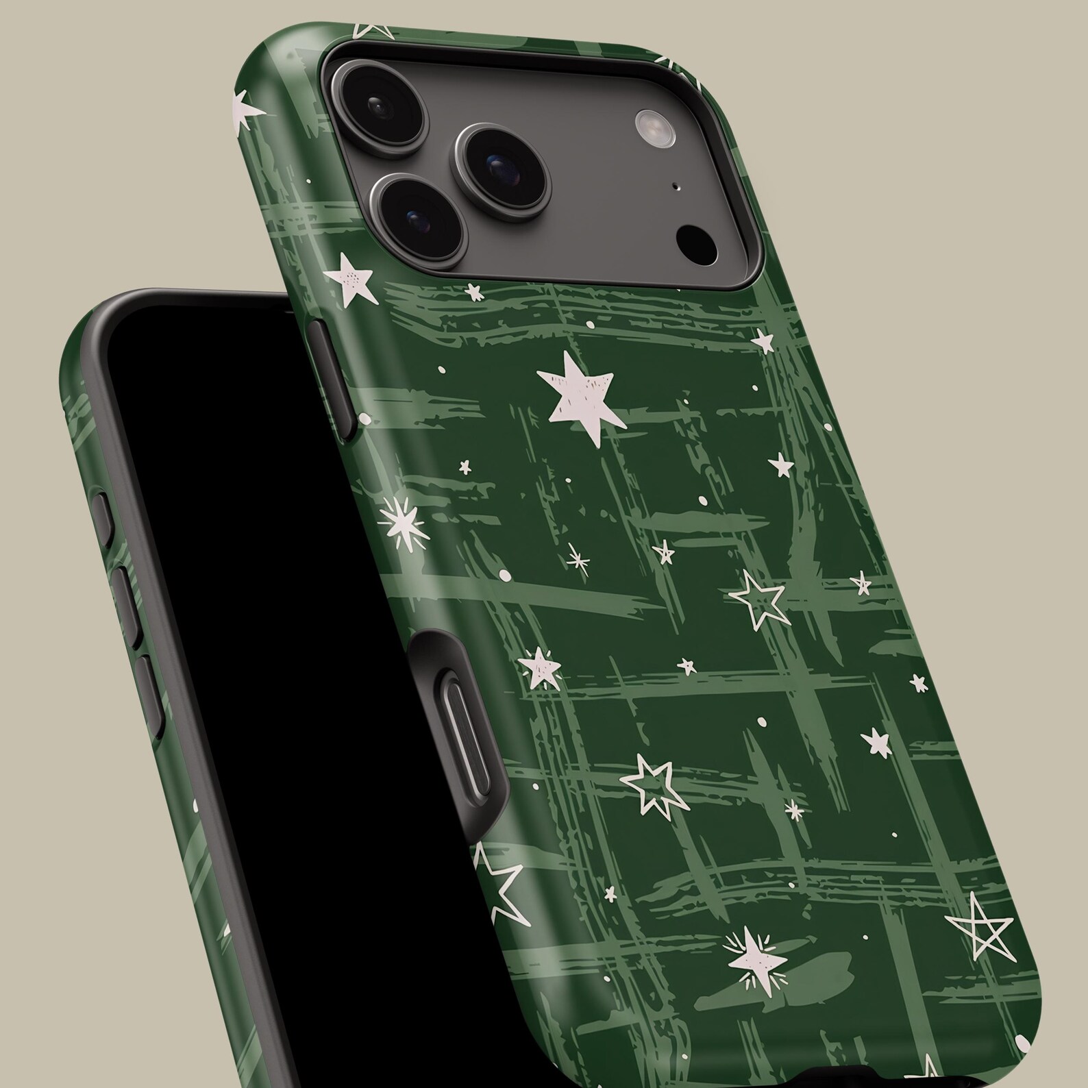This tough phone case features a playful star print against a rich green backdrop. The light-colored stars pop against the dark base, creating a charming and whimsical aesthetic. Made from durable materials, it offers reliable protection with a matte finish that feels great in your hand. Ideal for those who enjoy a modern and artistic vibe in their accessories.