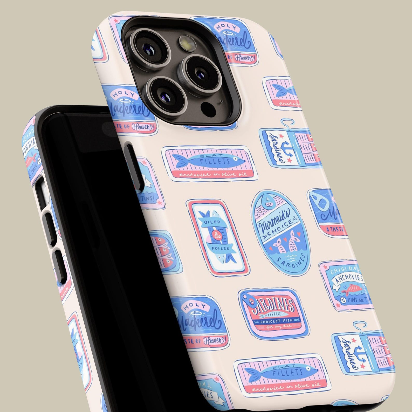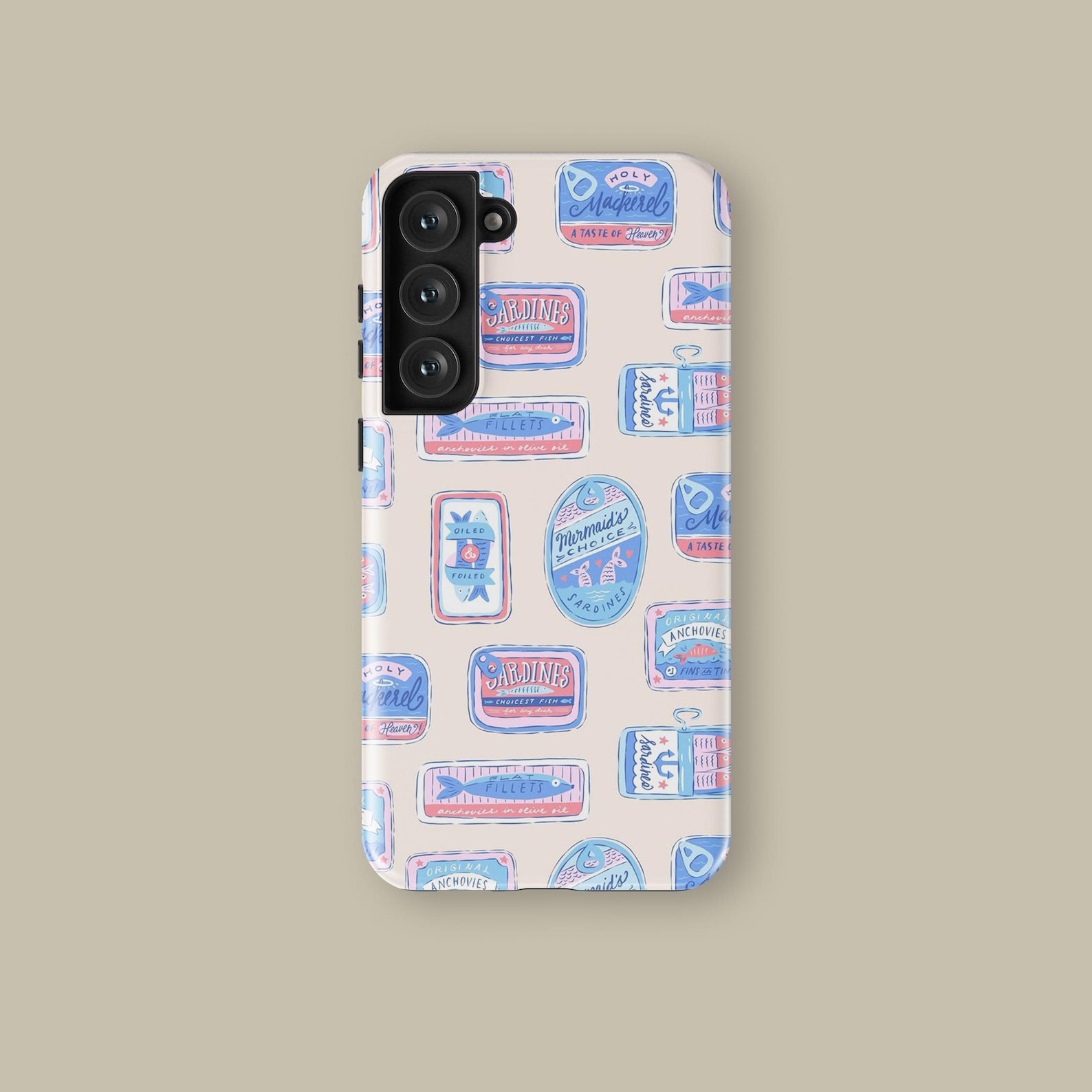 This playful phone case features a charming collection of vintage canned goods illustrations. The soft pastel colors of pink and blue create a light and inviting aesthetic. Constructed from durable material, it offers excellent protection while maintaining a sleek, glossy finish. Perfect for those who appreciate unique design, the overall vibe is both quirky and stylish, making it a standout choice for your phone.